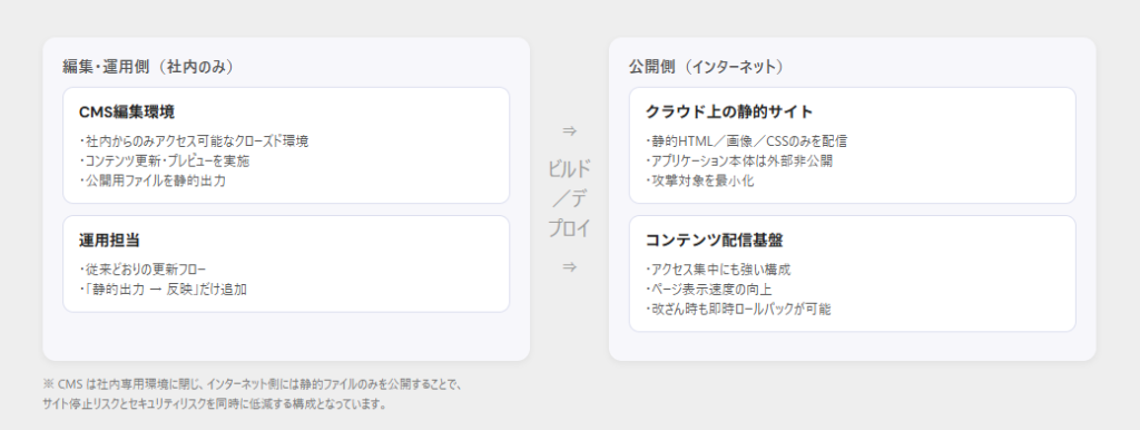 アプリケーションを安全な編集環境に閉じ、クラウド側では攻撃を受けにくい静的構造で公開することで、安定稼働・高速表示・運用負荷軽減を実現しました。