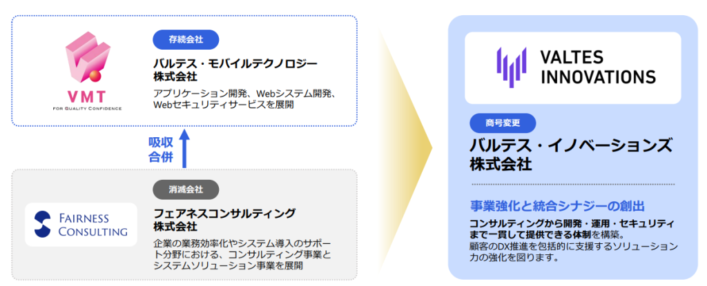 バルテス・モバイルテクノロジー株式会社は、アプリケーション開発・Webシステム開発およびWebセキュリティサービスを展開してまいりました。一方、フェアネスコンサルティング株式会社は、企業の業務効率化やシステム導入支援を中心としたコンサルティング事業およびシステムソリューション事業を展開しており、両社はそれぞれの分野で強みを持っております。