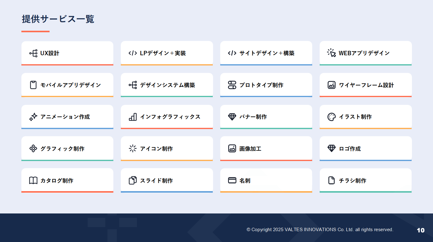 デザインは、会社やプロダクトの印象に繋がってくる経営にとって非常に重要なパーツであると考えています。そのため、デザインを提供するだけでなく、デザインを中心としたブランド全体の設計まで包括的に支援いたします。